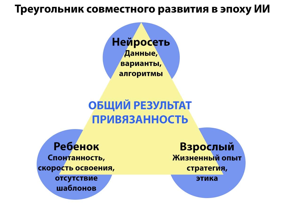 - Мост. Вы или ребенок ставите ИИ задачу (спроектировать маршрут, найти решение для аквариума, сочинить сказку). Вы управляете инструментом, а не он вами.