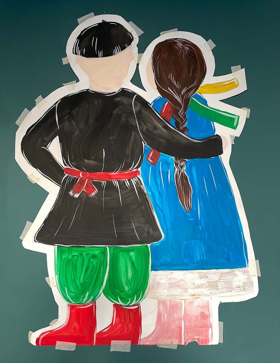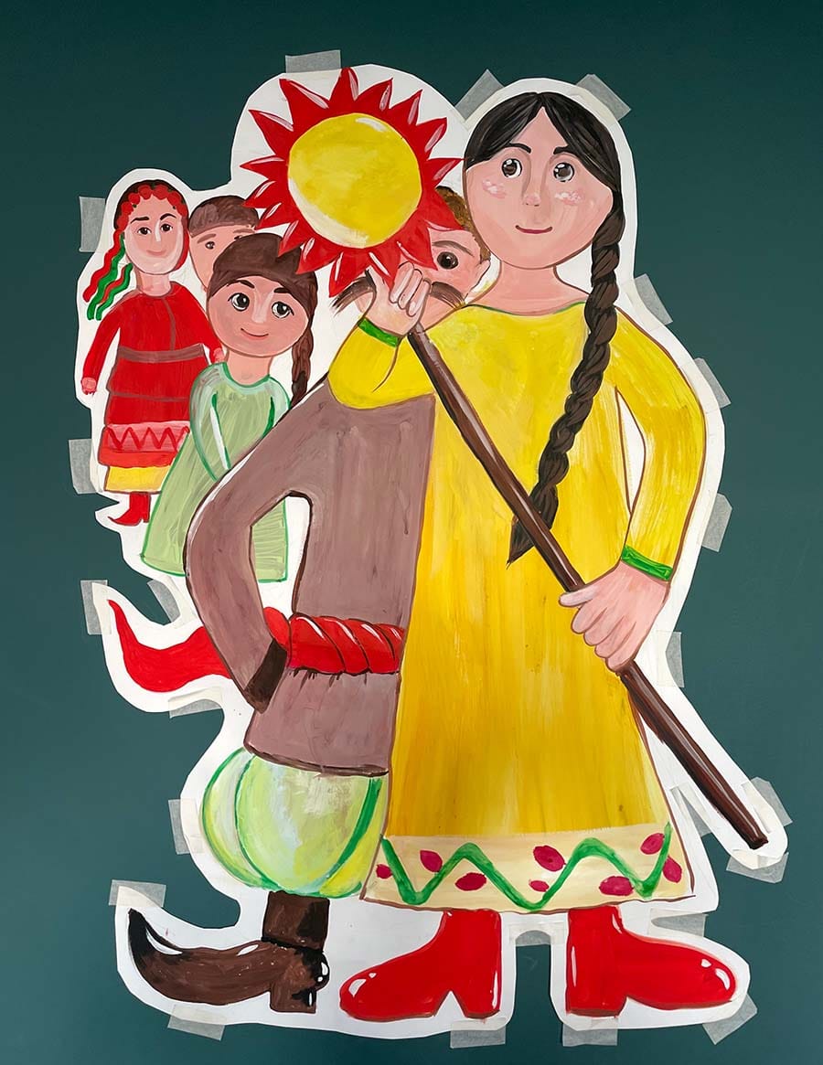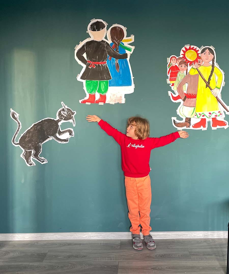 Но вот на Рождество 2024-2025 года класс получил нестандартное задание: оформить свой кабинет по мотивам Ночи перед Рождеством. В школе проводился конкурс, классы по жеребьевке получили разные произведения. Нашим достался Гоголь, слегка в обгон школьной программы. Забава посмотрела фильм и мультфильм, прочитала и осмыслила произведение, определилась с "раскадровкой" и главными героями, даже ИИ вам подскажет, что это Вакула, Оксана и Чёрт. Их и изобразила Забава на плакатах. Добавила для массовки иллюстрацию Колядки девчат. В последний момент еще появлялась Луна для интриги. В общем, все бы хорошо. Но Чёрт, он Чёрт и есть. С ним начали твориться чудеса. Мы все вместе украсили класс (Никита помогал, он на фото в кадре для масштаба). На следующий день Чёрта в классе не было. Кто-то из администраторов (уверяем вас, не филолог) стащил его и спрятал в чулан, сочтя сюжет не политкорректным. Были объявлены розыски, чулан открыт, Чёрт занял свое место в произведении. Не надолго, пара дней - он исчезает. Начались дипломатические переговоры. Все без исключения дети класса сходили и попросили, чтобы этот плакат им был возвращен. Для справедливости и полноты сюжета. Третейский суд постановил "и вашим, и нашим": Чёрту дали повисеть в день комиссии, но потом опять убрали его. Все это порядком его поистрепало. Не удивительно, что в таком блуждающем виде, Чёрт привлек больше внимания школы, чем если бы его изначально не трогали. Вот так Гоголь подвергся самосуду и цензуре. А Забава не расстроилась и с юмором описала эти приключения в своем сочинении по литературе. Она вообще умеет и по-настоящему всей душой переживать, и переворачивать этот опыт с юмором. Но если когда-нибудь из нее вырастет писатель, а не художник, мы знаем эпизод, который дал к этому толчок.