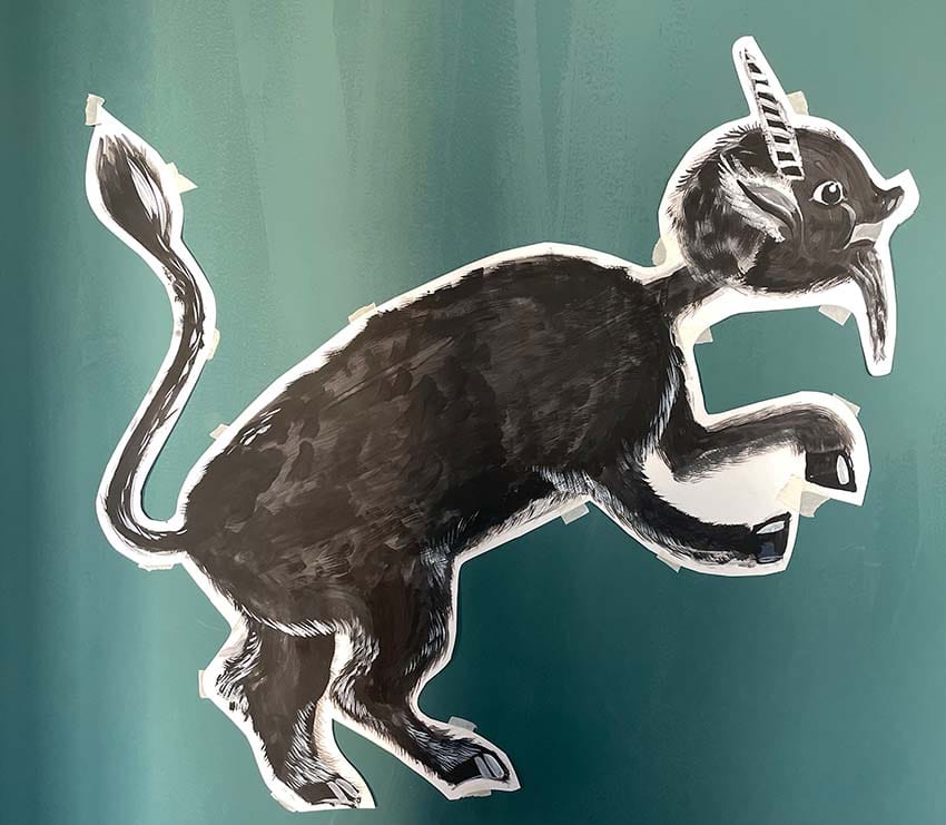Слева. Кот Моне. 2024. Бумага, гуашь, 300х400 мм. Справа. Радуга цветов. 2024. Холст, акрил, 300х400 мм