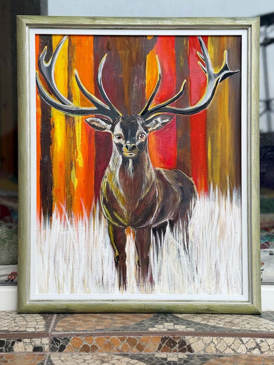 Здесь можно сказать несколько слов про родительскую жадность. Забава осталась неудовлетворена финальным состоянием этой картины. Она хотела показать взрослого оленя, а получился олень юный. И она переодически хотела схватить картину со стены и переписать её. А нам, по понятным причинам, этого не хотелось. Есть такая точка зрения, что какого бы персонажа ни рисовал художник он немного рисует себя. А Забава юна и её олень это высвечивает. И нам он нравится таким. Нам, но не ей. В общем, мы дождались удобного момента, когда Забаве для путешествия нужны были значительные карманные деньги. И выкупили эту картину. Она висит там же, где и раньше, но теперь она принадлежит нам (родителям). И мы регулярно ее выгуливаем - выставляем в городских кофейнях. И, знаете, когда ее дома нет, нам ее очень сильно не хватает. Потому что в ней есть кусочек Забавиной души.