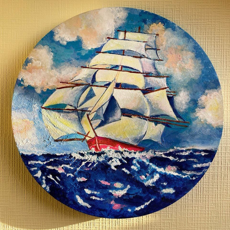 Эта работа (акрил, холст, 30 см) была сделана на заказ. Саша попросил для своего кабинета что-то английское. Дети поняли эту задачу каждый по своему. Никита нарисовал портрет нашей собаки Вуки Дуки (потому что это корги кардиган, а они родом из Уэльса, Англия). А Забава, зная любовь Саши к парусникам, решила нарисовать чайный клипер. Саша сказал, что эти парусники ему очень нравятся - они были очень нарядными, распушали огромное количество парусов, были скоростными, особыми, острыми, "резали воду". Эту комбинацию - воды, воздуха и корабля, несущегося по своим делам на всех парусах (очень подходящую по духу к Саше) и постаралась отработать Забава. Я (Лена Павлова), ей помогла, но незначительно. Моя работа здесь была - разложить тени на парусах. А вот море, небо, общую форму корабля и всю его первоначальную детальную проработку дочь выполнила практически самостоятельно. Роль учителя была в том, чтобы помочь разобраться в парусах, что там куда направлено, как наполняется и куда вертится, добавить динамики и проверить, чтобы не было "ляпов" по неопытности.