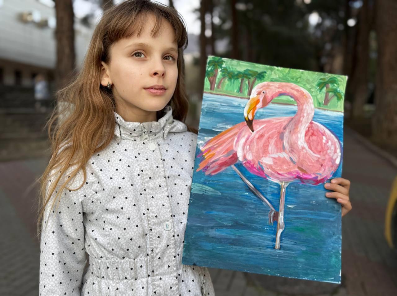 Писать акрилом - медленный процесс. Иногда работа над картиной занимает месяц уроков, чаще - два. И, хотя детям нравится иметь плотноплановый результат, который висит на козырном месте в доме, они могут выгорать от такого режима. Им хочется просто рисовать в удовольствие, не зависать на точности, не мучиться с большой детализацией. Но иногда их экспромты так хороши, полны жизни и эмоционально наполнены, что их тоже хочется оформить и повесить на стену. Уже несколько лет, например, родительскую кухню украшает этот розовый фламинго.
