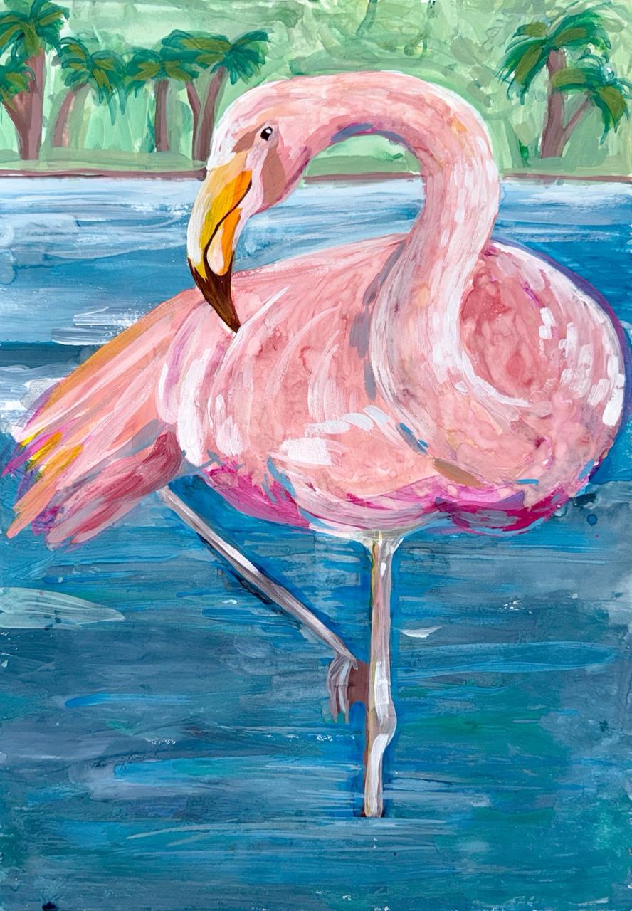 Розовый фламинго. Забава Чистова. Бумага, гуашь, 300х400 мм..